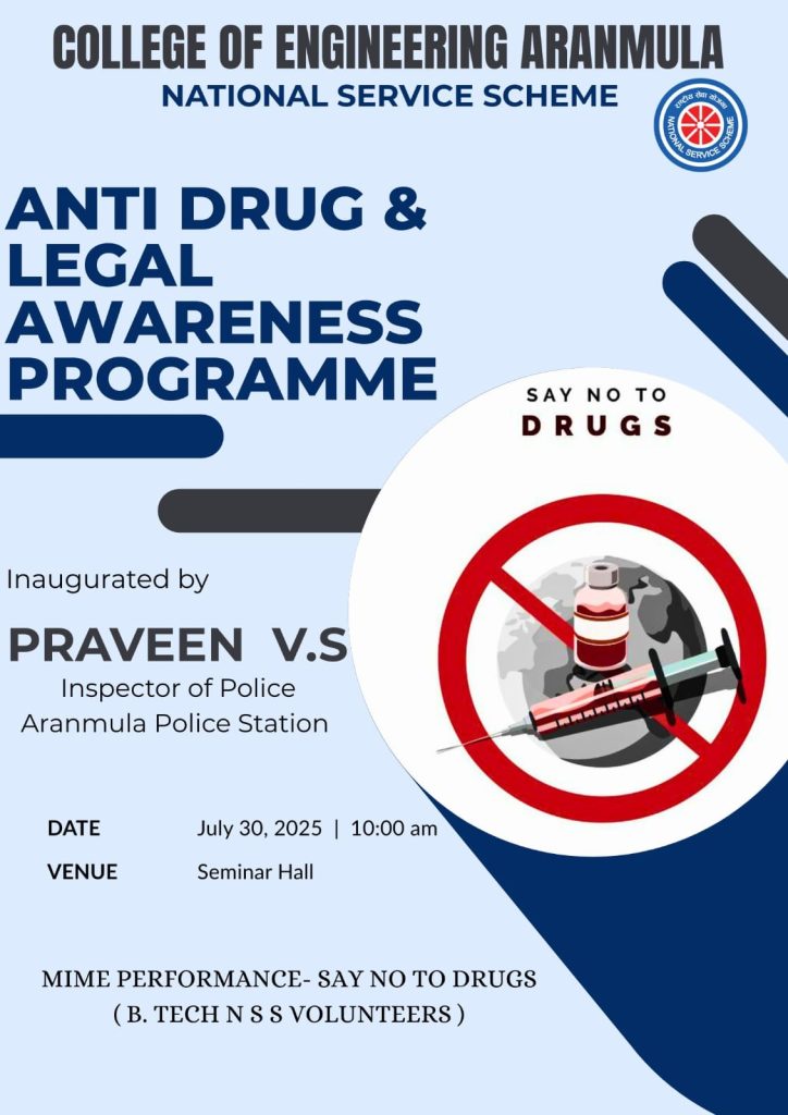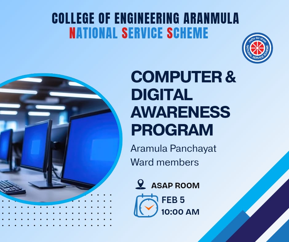 College of Engineering Aranmula has two NSS Units ( aided unit No: 336 and self-financing unit No: 618) under NSS technical cell. The NSS Unit of our college places an active role in shaping our students into social engineers. Now NSS Activities are included in the academic curriculum so that students are exposed to more opportunities for social services.